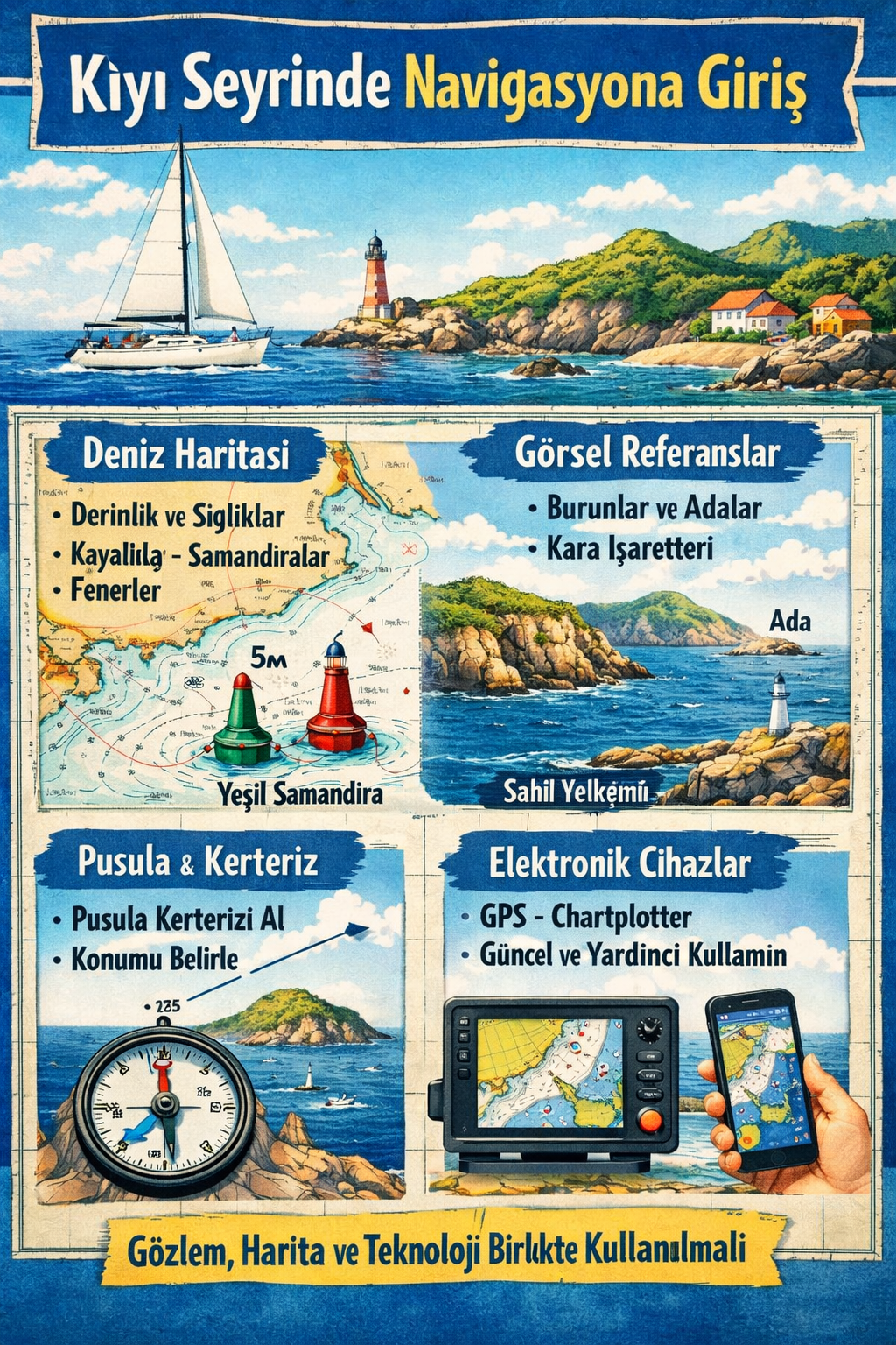 Kıyı seyrinde navigasyon, yelkenli kullanıcısına denizi “okumayı” öğretir. Harita, pusula, gözlem ve elektronik destek birlikte kullanıldığında; hem güvenli hem de keyifli seyirler mümkün olur. Bu beceriler geliştirildikçe, denizcilik refleksi güçlenir ve daha uzun, daha iddialı rotaların kapısı aralanır.
